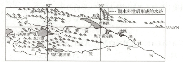 青藏高原可可西里地区的河流以降水补给为主,并有冰川融水补给。发源于该地区的楚玛尔河是长江北源之一,卓乃湖、库赛湖、海丁诺尔湖和盐湖是该地区的重要湖泊。20 世纪 80 年代以来,可可西里地区气温持续上升,降水增加。2011 年 8 月中下旬至 9 月上旬的强降水导致卓乃湖湖水外泄,依次贯通了库赛湖、海丁诺尔湖和盐湖。下图示意卓乃湖周边地区地理环境。