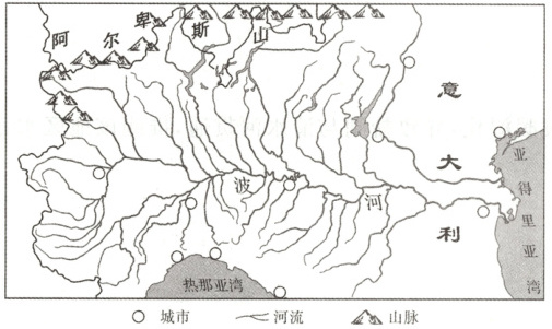 波河全长 652 千米,自东向西横贯意大利北部地区,流域地势西高东低,西部上游是连绵起伏的高山,中、下游是著名的波河大平原,河道蜿蜒曲折。河流沿途地势平坦,含沙量大,下游地区沉积旺盛,河道高出河床 6 米,形成地上河。下图为波河流域图。
