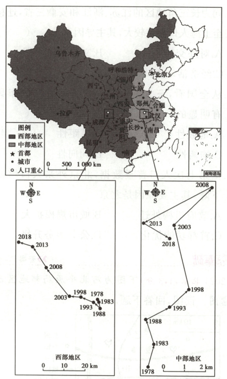 (2023海南,1—2,6分)人口重心是指区域空间中人口数量可维持空间均衡的受力点,其时序变化可反映区域发展的空间演变轨迹。随着西部大开发、中部崛起等国家发展战略的实施,区域内人口重心迁移明显。下图示意1978—2018年我国中部和西部地区人口重心迁移轨迹。据此完成下面两题。