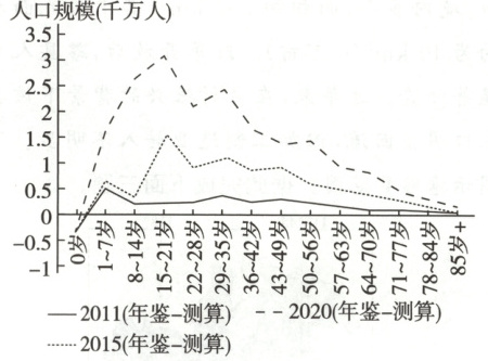 11 B 根据图中数据可知,2011—2020年实际统计年鉴人口与测算人口年龄结构的差值几乎都为正值,说明人口净迁入且呈增长趋势,推测乡村劳动力人口减少,经济活跃度减少,B正确。