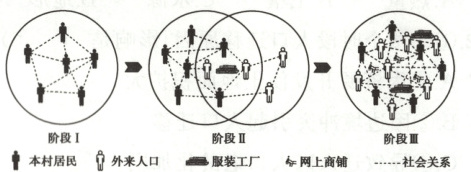 (2022 江苏,21—23,6 分)近四十年来,我国乡村地区经济形态、土地利用、社会结构和生态环境等方面发生着深刻变化。下图为“网商集聚的某村落社会关系网络演变示意图”。据此回答下面三题。