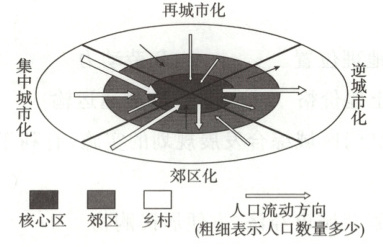 (2024江苏,20—22,6分)城镇化主要表现为人口在城乡间的迁移,一般分为集中城市化、郊区化、逆城市化和再城市化4个阶段。下图为“城镇化阶段模式图”。据此回答下面三题。