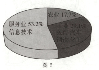 解析 读图2可知,该国农业占比为17.7%,占比偏高,农业人口多;工业占比仅为29.1%,占比偏低,且工业以汽车、钢铁、化工和医药等资金和资源密集型产业为主;服务业占比虽高,但以信息技术产业(属于高新技术产业)为主,该国的劳动密集型企业较少,对劳动力的需求量有限,工业和服务业吸纳的劳动力较少,导致该国城镇化水平较低。