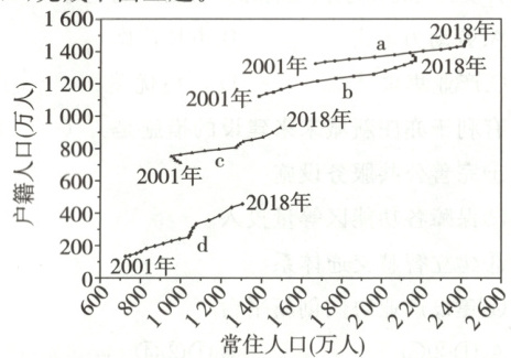 (2025海安2月模拟,16—18)新型城镇化是实现共同富裕的关键。自2014年新型城镇化成为国家战略以来,中国城镇化持续快速演进。下图为2001—2018中国4个超大城市(现阶段常住人口大于1 000万人)的常住与户籍人口变化,完成下面三题。