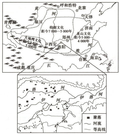 材料二 下图为“中国新石器时代主要文化区的地理分布略图”及“洛阳盆地仰韶文化聚落遗址分布略图”。