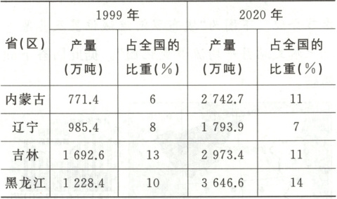 (2024 浙江 1 月选考,12—13,4 分)北方产区是我国玉米的主产区。下表为 1999 年、2020 年北方产区的四省(区)玉米产量及占全国的比重。完成下面两题。