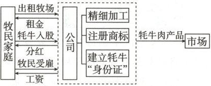 5B结合图文材料可知,甲公司生产有“身份证”的牦牛肉,给牦牛肉建立产品质量追溯体系,注册商标树立品牌,提高产品知名度,增加了销量;同时对牦牛肉进行精细深加工,延长产业链,附加值提高,因此牦牛价值提高,②③正确。甲公司采用“公司+农户”模式生产牦牛肉,属于专业化经营,也没有通过扩大放牧规模提高收入,因此①④错误。B项正确。