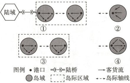 (2023 湖南,3—4,6 分)港口地域组合是指一定地域范围内的诸多港口长期相互作用,形成具有某种分布格局、结构形式和功能类型的组合。下图示意海岛港口地域组合演变的不同阶段。据此完成下面两题。