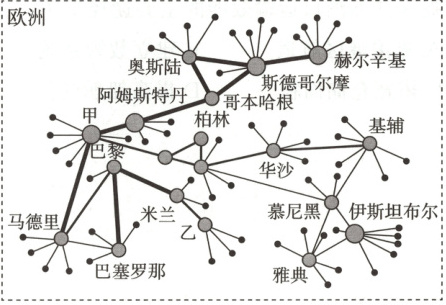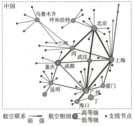 1 C 根据地理位置及各航空枢纽的等级可知,甲地位于欧洲西部,等级高,为伦敦;乙地位于欧洲南部,靠近米兰,等级较高,为罗马;丙地为我国西北地区的航空枢纽,等级较高,为西安;丁地靠近广州,等级高,为深圳。