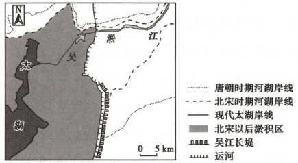 (2023 福建,8,3 分)唐朝时期,吴淞江未形成较稳定的河道。北宋时期,吴江长堤建成后,吴淞江河道日趋稳定,成为太湖的主要泄洪通道。近代以来,吴淞江成为上海港体系的一部分。下图示意唐代以来太湖东部水系的演变过程。据此完成下题。