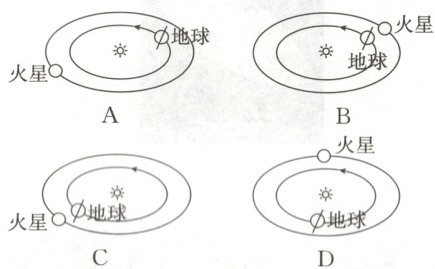 1 B 出现“火星冲日”时,火星、地球、太阳依次排成一条直线,且地球位于火星与太阳之间。1月16日地球经过了公转轨道的近日点位置,此时太阳直射南半球,与图B地球位置相符,B项正确。