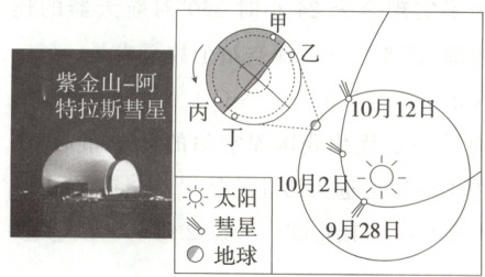(2025 常州一模,4—5)彗星是太阳系中的一类小天体,当其接近太阳时,由于太阳辐射和太阳风的作用,彗星的挥发物升华而形成彗尾。紫金山—阿特拉斯彗星在 2024 年 9 月 27 日过近日点,10 月 12 日过近地点。下左图为珠海$(22^{\circ}N,113^{\circ}E)$摄影师拍摄的彗星升起的照片,下右图示意彗星到访期间天体位置关系。据此完成下面两题。