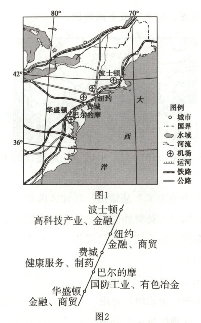 材料二 图1为北美部分地区略图。图2为波士华城市带主要城市的支柱产业。