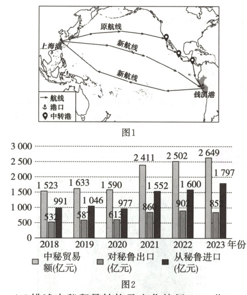 (1)根据中国一秘鲁进出口贸易统计图可知,中秘贸易总额在2018—2023年总体增长;中国从秘鲁进口额始终大于出口额;进口额和出口额差距逐步扩大。