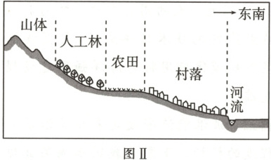 (2022 湖南,8,3 分)某地(图Ⅰ)位于太行山南段东麓,该地山势险峻,多暴雨,易发山洪。为适应当地地理环境,该地形成了西北—东南向的“山—林—田—村—水”空间格局(图Ⅱ),体现了当地居民的生存智慧。据此完成下题。