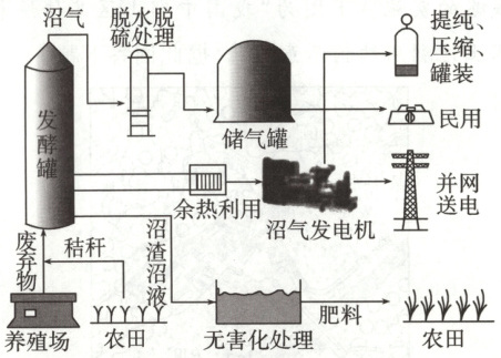 (2022 浙江 6 月选考,13—14,4 分)将养殖场废弃物和农田秸秆等处理生成甲烷,并通过内燃发电机组进行发电,是生物质天然气利用的重要方式,既可发电还为农田提供优质肥料。下图为该项目实施示意图。完成下面两题。