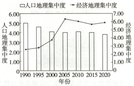 拓展 京津冀地区经济发展和人口空间分布都呈现明显的差异性。下图示意 1990 年至 2020 年京津冀地区人口与经济地理集中度指数的均值变化(数值越高,集中度越高)。完成下面两题。