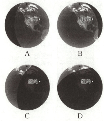 3A 据上题分析得知日出时纽约地方时约为5:04,经过6 小时之后纽约地方时约为11:04,纽约应该已经是完全白昼,A 正确;B图中纽约虽然在白天,但其位置十分接近其东侧的昏线,说明B图时纽约是在正午12时之后,不符合题意,B错误;C、D两图中纽约在黑夜,不符合题意,C、D错误。