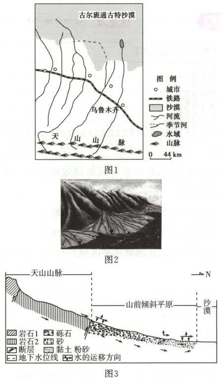材料二 图 1 为天山北麓部分地区略图。图 2 为洪积—冲积扇示意图。图 3 为天山北麓—古尔班通古特沙漠某剖面示意图。
