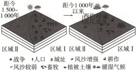 (2)由材料二可知,在距今1500~1000年,区域Ⅰ的风沙活动增强,区域Ⅱ的风沙活动较弱;在距今1000年以来,区域Ⅰ和区域Ⅱ的风沙活动都增强。即区域Ⅰ风沙活动开始增强的时间比区域Ⅱ早。距今1500年以来,区域Ⅰ人类活动(主要为战争和农牧业扩张)强度较大,其对自然植被的破坏使得该区域植被覆盖率下降,长期的人类活动使得区域Ⅰ风沙活动一直在增强,开始时间早、持续时间长;距今1000年以来,区域Ⅱ西伯利亚高压增强,气候变得冷干,风沙活动增强时间较晚。