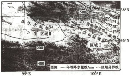材料一 青藏高原东北部气候环境存在较明显空间差异。区域Ⅰ年均气温$3\ ^{\circ}C~8\ ^{\circ}C$,年均风速 2 m/s 左右;区域Ⅱ年均气温约$1\ ^{\circ}C$,年均风速 4 m/s 左右。下图示意青藏高原东北部及区域Ⅰ和区域Ⅱ的范围。