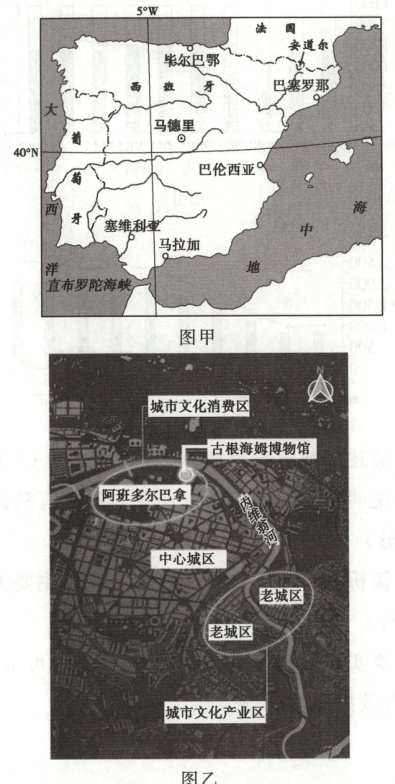 材料一 西班牙毕尔巴鄂市(图甲)曾是一座依托铁矿资源的传统工业港口城市,因资源枯竭而逐渐衰落。随着城市的规划更新,现已成功转型为文化导向型旅游城市。它始建于 1300 年,随海上贸易因港口而兴,19 世纪发现铁矿,成为著名的工业城市。20 世纪中叶随着资源枯竭,城市衰退。20 世纪 90 年代初,毕尔巴鄂市沿内维翁河进行城市更新改造,通过建造一系列大型文化设施和打造文化项目来实现城市形象的转变,尤其是 1997 年竣工的古根海姆博物馆,是毕尔巴鄂城市转型的里程碑。一座博物馆救活了一座城市,形成“古根海姆效应”。如今毕尔巴鄂市已经成为艺术产业全链条发展的创意城市和设计之都。
