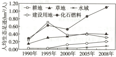 (2025海安2月模拟,19—21)下图示意1990—2008年我国西南生态脆弱区不同土地类型的人均生态足迹(指维持区域人口生存所需、具有生物生产力的地域面积)变化。据此完成下面三题。