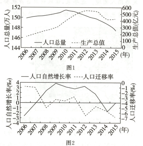 (2025海安期初,21—23)《2019年新型城镇化建设重点任务》中首次提出“收缩型城市”概念,明确要求收缩型城市要“瘦身强体”,引导人口和公共资源向城区集中。黑龙江省双鸭山市是重要的煤炭资源型城市,湿地、森林资源丰富,近年来也出现了城市收缩的现象。图1为“双鸭山市2006—2015年生产总值和人口总量变化示意图”,图2为“双鸭山市2006—2015年人口变化示意图”。完成下面三题。