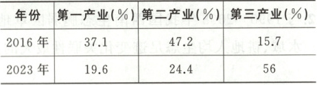 材料二 阿坝州矿产及水力资源丰富,但一直是我国较为贫困的地区之一。2016年以来随着国家精准扶贫工作实施,阿坝州加快产业结构优化调整,产业实现成功转型,于2020年成功脱贫。下表为阿坝州2016年和2023年产业结构统计表。