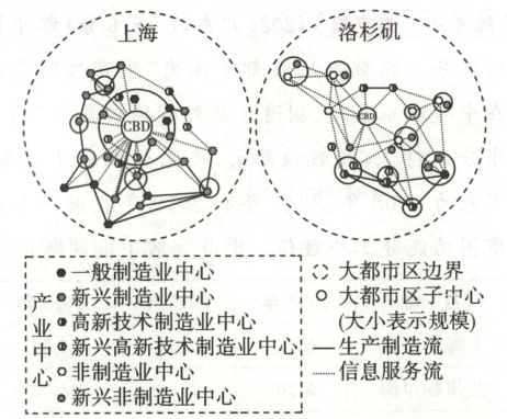 (3)根据图文材料,上海中心主城区范围巨大,主导作用明显。结合“郊区新城(卫星城)蓬勃发展”“伴随新产业空间的兴起与拓展,上海和洛杉矶两大都市区呈现多中心城市空间组织结构”等文字信息,可以推出上海前期是以单中心(主城区)为主的空间组织结构。依据材料信息“产业结构由传统制造业主导向先进制造业和现代服务业主导快速转变”,可以推出上海前期主城区产业结构中传统制造业比重较大,传统制造功能突出。后期,上海通过郊区五大新城反磁力中心建设,呈现出主城区主导的多中心空间组织结构。中心主城区CBD范围较大,以生产性服务业为主,辐射带动功能强大,反映出主城区高端服务功能日益突出,主导作用明显;同时郊区五大新城通过产业中心带动,形成了具备较大规模与较强功能的反磁力子中心。结合图示主城区新兴产业中心的布局,可以看到主城区制造产业结构也在升级调整。根据文字材料结合产业中心关联特征可知,在“政策与市场共同作用下”,上海主城区主导的多中心城市空间组织结构是伴随着产业结构转型、升级、调整和相关产业转移、扩散、集聚,依托交通运输和信息网络建设,倚重产业中心的产生和扩散而形成。