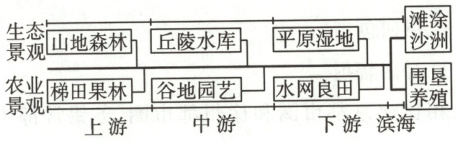 解答本题首先需要从示意图中获取该流域不同区段的生态景观和农业景观类型,其次需要调用我国东南沿海地区的自然环境特征知识。