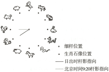 3D 结合材料及图示所给信息可知,夏至日北京时间9:20时杆影指向生肖鸡,即地方时8:20时杆影指向生肖鸡;杆影指向生肖鼠时,地方时为12时,由此可知当地方时为15:40时,杆影指向生肖兔;夏至日日落时杆影指向生肖龙;由于该日为夏至日,结合当地纬度为37°N,可知当日昼长夜短,日落地方时晚于18:00;综上可知,该地夏至日地方时为16:00时,杆影指向生肖兔与龙之间,D正确。