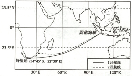 (2020江苏单科,7,2分)选择大洋航线时,应在确保航行安全的前提下,充分考虑气象、海况条件和岛礁等因素,尽可能沿地球表面大圆(以地心为圆心过地表两点的圆)航行。下图为“巽他海峡西行好望角的大洋航线示意图”。据此回答下题。