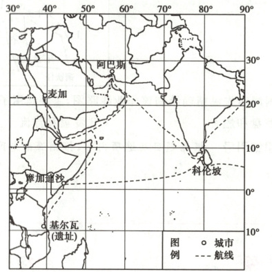 (2021江苏,18,2分)公元8世纪开始,基尔瓦逐渐成为非洲东海岸的商贸中心。15世纪初郑和船队曾从不同航线到达基尔瓦。17、18世纪随着世界贸易格局不断改变,基尔瓦商贸地位逐渐衰落。1981年基尔瓦所在地的遗址被列入世界遗产名录。下图为“郑和船队航海路线示意图”。据此回答下题。