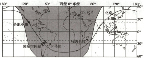 (2022江苏,4,2分)国际空间站距地面约420 km,每90分钟环绕地球一周。空间站反射阳光,在一定条件下,人们肉眼可以看到明亮的光点划过天空。下图为“国际空间站某时段轨迹和某时刻位置示意图”,图中阴影表示黑夜。据此回答下题。