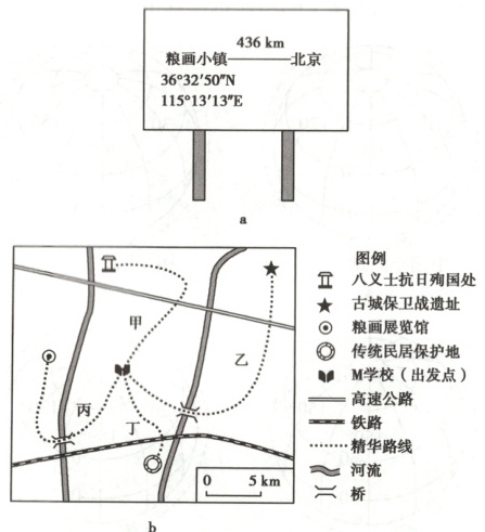 (2021北京,1—2,6分)我国某镇利用当地主产的粮食制作粮画,打造粮画小镇。图a是M学校设计的小镇地理位置指示牌,图b是该校设计的四条“行走的思政课”精华路线示意图。读图,回答下面两题。
