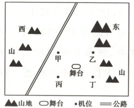 9D 该地7月23日日落西北,根据“被拍摄的主体恰好处于光源和相机之间的状况称为逆光拍摄”可知,拍摄舞台机位宜选择在东南方位,图中丁机位位于舞台的东南方位,D项正确。