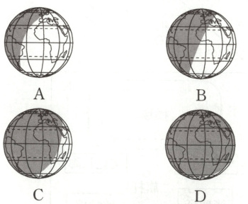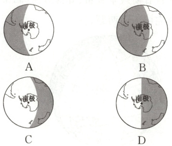 12A 已知太阳直射15°S,此时南半球昼长夜短,南极点附近(75°S以内)有极昼现象,选项A与之相符,A项正确;选项B图示南极点附近有极夜现象;选项C图示南极圈内出现极昼现象,极昼范围过大;选项D图示全球昼夜平分。