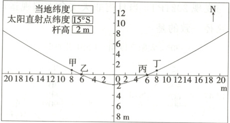 11D 当地地方时18:00,太阳位于该地的西南方向(太阳直射南半球,南半球除极昼地区外,日落西南,18:00太阳未落,位于西偏南方向),影子方向与太阳光线方向相反,杆影位于东偏北方向,即图中的丁处,D项正确。