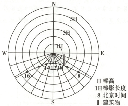 (2025常州期末,4—6)棒影日照图是根据太阳周日视运动绘制的棒和棒影关系的轨迹图,可用来计算建筑物朝向、建筑物阴影范围和阳光射入室内的面积等。下图为我国某城市12月22日棒影日照示意图。据此完成下面三题。