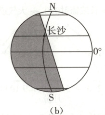 (2023广东,9—10,6分)2019年5月28日,某科研团队利用往返式探空气球,在长沙观测站($28^{\circ}07'N,112^{\circ}17'E$)收集了四个不同时刻释放的气球所记录到的太阳短波辐射量变化信息(图a)。图b为其中某一时刻对应的太阳光照示意图(阴影部分代表黑夜)。据此完成下面两题。