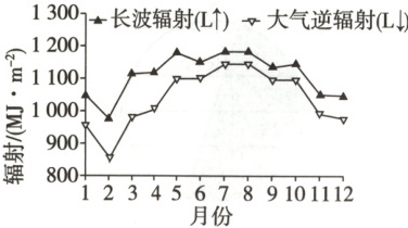 (2024广东,3—4,6分)有效辐射为下垫面向上长波辐射与大气逆辐射的差值。下图表示2003—2012年云南省西双版纳热带季雨林林冠层向上长波辐射(L↑)及其上大气逆辐射(L↓)的月平均变化。据此完成下面两题。