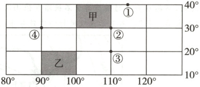 3 D 跨经纬度相同的区域,纬度越高实际面积越小,甲区域纬度高于乙区域,面积小于乙区域,A错误;地球自转线速度随纬度升高而减小,①地纬度高于②地,线速度更小,B错误;②、④地同位于30°N,经度差20°,纬线上距离为111×cos30°×20≈1923km<2220km,C错误;③地(110°E,20°N)在我国海南岛北侧,其位于伦敦东南方向,D正确。