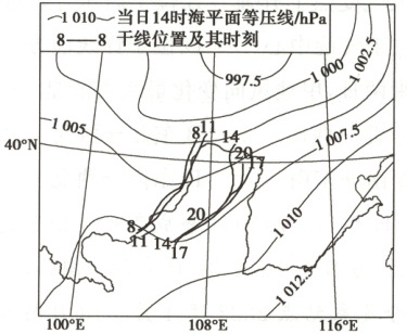 (2024 江苏,6—7,4 分)干线是干气团与温度相近的湿气团交汇而形成的天气系统,其形成与特定下垫面有关,常引发强对流天气。下图为“河套地区某日干线位置移动图”。据此回答下面两题。