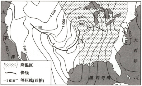 (2022 江苏,7—9,6 分)2022 年 3 月 25—30 日,北美部分地区受到冷空气影响,出现降温。下图为“冷空气影响期间降温范围及 31 日地面天气形势图”。据此回答下面三题。