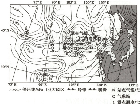 (2023 江苏,11—13,6 分)蒙古气旋是发源于蒙古国的温带气旋。下图为“某年 4 月 9 日某时刻亚洲局部地区海平面天气图”。据此回答下面三题。