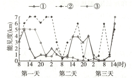 (2023 浙江 6 月选考,24—25,6 分)贵州中西部地区冬季多出现水平能见度小于 1 千米的锋面雨雾,雾区位于锋线附近。下图为贵州某次锋面雨雾发生过程中,大致呈纬向分布的三个测站测得的能见度变化图。这次雨雾形成的气象条件是西南气流沿锋后弱冷平流爬升,形成弱降水。雨雾随锋面缓慢东移消亡。完成下面两题。