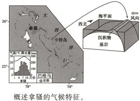 解析 读拿骚的气温曲线和降水量柱状图可知,拿骚全年气温在20℃以上,全年高温,气温年较差小;年降水量较大;5~10月气温较高,月均降水量超过100mm,降水量较多,为湿季;11月~次年4月气温稍低,降水量较少,为干季。