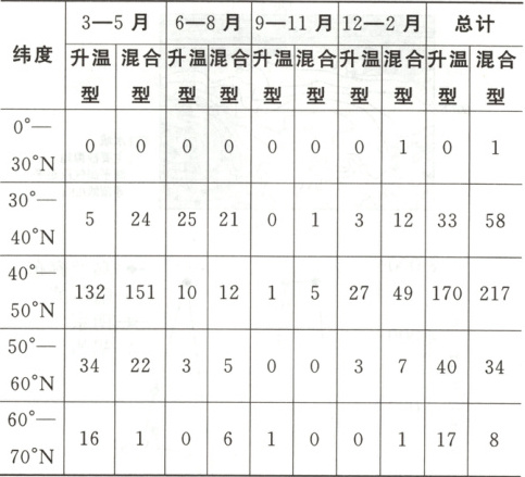 (2023湖南,11—13,9分)融雪洪水灾害由大量的积雪快速融化引起,可分为雨雪混合型(简称“混合型”)洪水灾害和升温融雪型(简称“升温型”)洪水灾害,融雪洪水中常夹杂着冰凌和融冰。下表示意1900—2020年北半球融雪洪水灾害频次。据此完成下面三题。