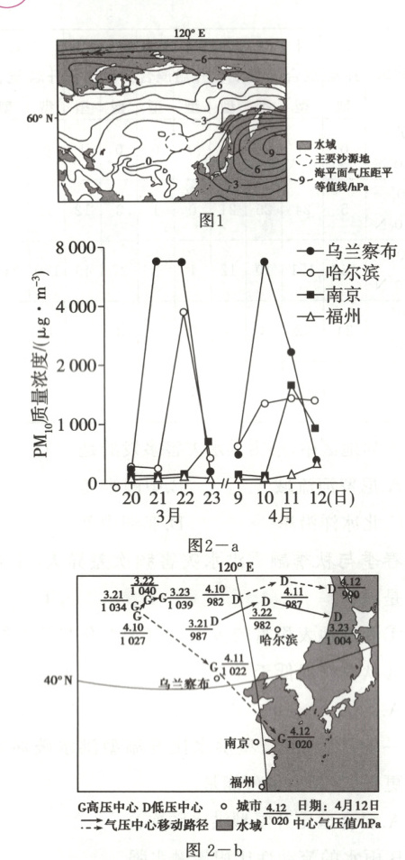 (3)据图2—a,指出与3月相比,4月沙尘传输强度和路径的特点,结合图2—b分析差异产生的原因。(8分)